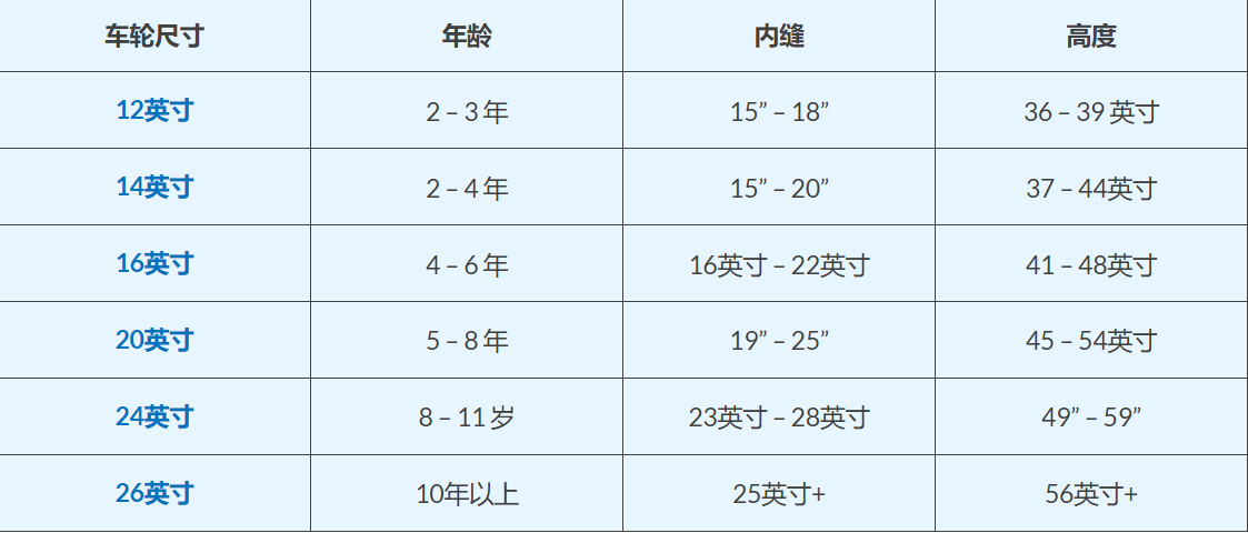 兒童自行車尺寸表